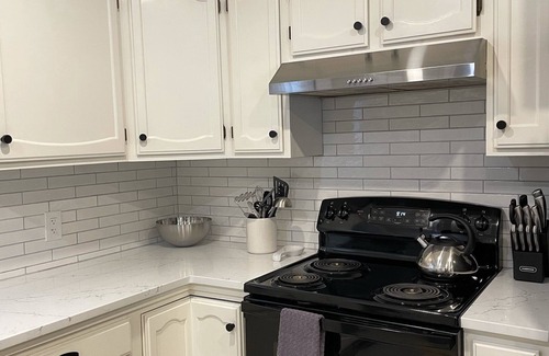 The kitchen is an open, bright, clean and accommodating space with a range oven, microwave, dishwasher, coffee bar and refrigerator. Next to the kitchen is the laundry room with a washer and dryer. And the main floor bathroom. In each bathroom both upstairs and downstairs, there are blow dryers provided if needed.