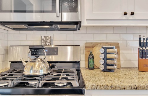 Walk through the rosé pinkfront door into the stylish living and dining area. In the living room you’ll find a Smart TV, comfy couch and a cozy reading corner with a plush chair and reading lamp. Enjoy breakfast and coffee in the dining nook at a table set for four. The chic galley kitchen has stainless steel appliances and all the essentials needed to whip up a meal. Small appliances include a Keurig coffee maker, microwave, toaster and hot water kettle. Washer/dryer is tucked behind the kitchen and is stocked with laundry detergent and dryer sheets for guest use.