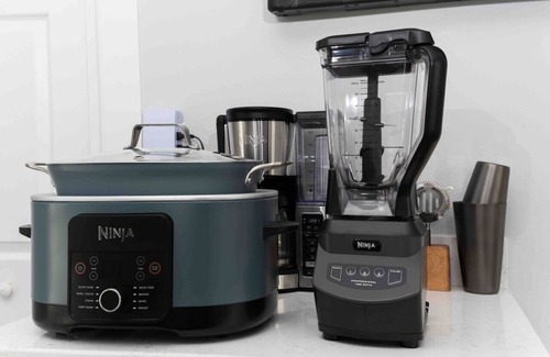 Kitchen that sits 6 w/blender, coffee & tea bar, ninja foodies & air fryers, chef knife set, and smart TV with a crisp Bluetooth soundbar.