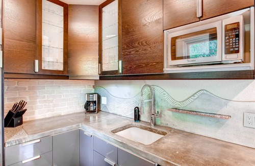 The modern kitchen is fully equipped to make cooking at home a pleasurable experience. You'll find stainless steel appliances, gas stove & oven, hand crafted concrete counter top with embedded pyrite ammonite. The kitchen is wrapped in exposed sandstone bricks from the original house design. The Dining area features 4 Mid-Century Modern chairs and an oak table.