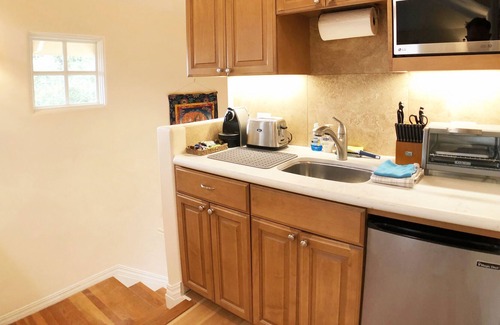 The mini-kitchen is fully stocked with chopping knives and utensils, Nespresso coffee maker, coffee press, toaster oven, microwave, 2 mini-fridges, electric kettle, crock pot, and an electric induction stove. It's perfect for breakfast, a quick lunch or full dinner, and snacks whenever you want.