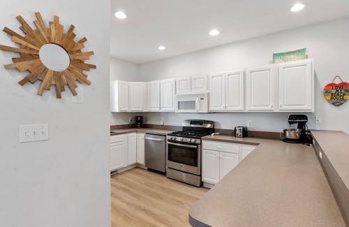 After a day at the beach or exploring Corolla, come home and relax in the open-concept great room that features soaring, two-story ceilings and an abundance of natural light. The living area leads out to a comfortably furnished screened porch overlooking the secluded backyard surrounded by mature trees. The charming front porch includes another seating set for an additional place to spend time outdoors. When you're not dining out, prepare meals at home in the kitchen that features stainless steel appliances and a gas cooktop. All three bedrooms are conveniently located together on the top level. The spacious primary suite includes a private bath with dual vanities and a jetted tub. Tile and LVP flooring run throughout the entire home, including the bedrooms. The upstairs loft includes a workspace where guests can use the home's 1GB internet to stay caught up with work or school remotely.