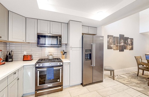 The remodeled gourmet kitchen boasts sleek countertops, all-new KitchenAid stainless steel appliances, and access to the front patio with grill. Convenient gadgets include a blender, toaster, and Keurig.