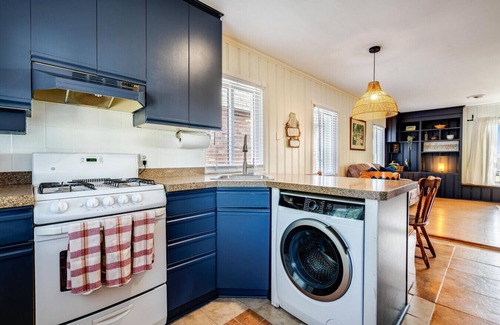 The cabin’s layout flows naturally as you move through it. Step into the fully equipped kitchen, with all the essentials for cooking and laundry facilities for your convenience. Just past the kitchen, the breakfast nook and indoor dining area provide a bright, comfortable space for morning coffee or casual meals. From there, the living room invites you to relax on comfortable couches around the central fireplace, perfect for cool autumn evenings.