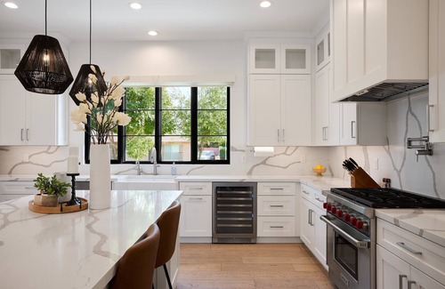 - Large kitchen island with bar seating for 5 guests