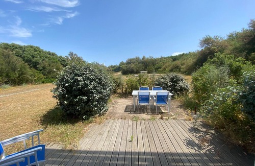 In a holiday residence with a swimming pool (open from June to September) and direct access to Valentin Beach, a duplex apartment comprises: a living room with a fitted and equipped kitchen (4-burner hob, microwave, dishwasher, filter coffee maker, and refrigerator with a small freezer compartment), a bathroom with a toilet, upstairs: two bedrooms with double beds (160x200), a bathroom, and on the landing, a bunk bed (two single beds 90x190). In front of the apartment, there is a large terrace and a small garden facing southeast. You also have a private parking space in the above-ground car park. We offer optional: - linen rental and a cleaning service.