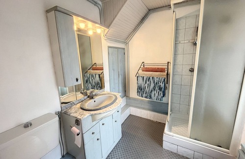 Located 400 meters from the town center and Plat Gousset beach, discover this uniquely styled duplex apartment with a terrace and private entrance. It comprises an entrance hall (washing machine, sink), a bedroom with a 160cm double bed, and an en-suite bathroom on the ground floor. A narrow staircase leads to the first floor, where you'll find a living/dining room with a dining table, TV, and sofa, opening onto a terrace equipped with a table and a lounge area, a fully equipped kitchen area (induction and vitro stovetop, combination oven, microwave, dishwasher), a bedroom with two 90cm single bunk beds and a 90cm pull-out bed, and a bathroom with a toilet.