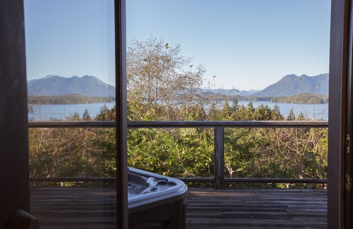 EAGLE VIEW HOUSE: Perched high on a hill, Eagle View House has stunning panoramic views stretching from Bedwell Glacier over Lemmins Inlet through the old growth forests of Meares Island, Clayoquot Sound and Tofino Harbor—you can see all the way to open ocean! The house was custom designed by the award-winning architect George Morrow. Located a short walk away from the many art galleries, restaurants and shops of Tofino. This house offers a unique accommodation experience. Lovely local beaches, kayaking, surfboard, wetsuit & boogie board rentals and whale watching are just down the hill. The view is fabulous, yet the location is quiet, private and you feel like you're a world away. In addition to the house being on Tofino's doorstep, Chesterman Beach is a five-minute drive away. Please note to get to Eagle View House's stunning views, there is a long steep driveway.