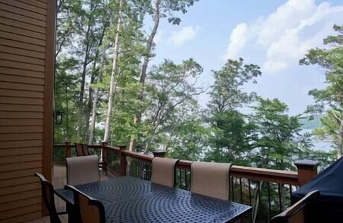 This listing includes the upper two levels of our luxury vacation home with a view of the lake that will take your breath away. It boasts 3 large private bedrooms and a loft sleeping area – all with lake views. You’ll also have 2 ½ baths and full-width front porch and lakeside deck with gas grill and plenty of seating to watch those beautiful morning sunrises. The Great Room has a gas fireplace and large sectional for enjoying the spectacular view through a wall of windows or watching TV on those rainy days inside. The kitchen has an incredible amount of cabinet and pantry space, a dual-fuel range, a microwave, and a French-door refrigerator. At the end of the granite countertop, you will find a 6-person bar with an ice maker. The hickory dining table seats up to 12 and the tables on the lake-side deck seat another 12. Walk down the hillside stairs or trail to the lake shore area with a picnic table and private dock space for your boat and other water toys. Another table with four chairs sits on the dock for relaxing and viewing all the eagles and loons during the warm months. Book your summer week or off-season short stay now at our Northwoods paradise!