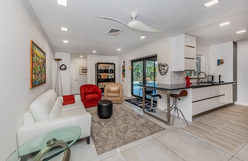 Beautifully appointed home 3.2 Miles to Siesta Key, close to downtown, Interstate 75. One level living, two bedrooms one king in primary, one queen is secondary. Updated baths, kitchen never before offered in rental service. Office w/printer and high speed internet, laundry facilities. Solar heat pool with screened lanai. You can relax while getting acquainted with area. Perfect for the folks waiting to have home delivered.