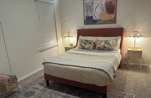 Welcome to the Ranch! Here we provide you with a space to eat, play and rest. This “Tropical Boho” room is the perfect get away or workspace. In addition to have having a private room and shared bathroom (across hall) Redbird Ranch has many things to offer.