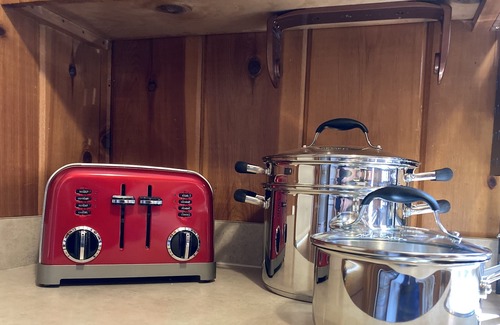 Original ‘50’s style cabin in a quiet corner of town. Mindfully outfitted for four close friends or small family to have sustainable and memorable fun. Cross between smart design of a boat and a Tardis - bigger on the inside than the outside - enter the expansive family-kitchen area room find a game cabinet that is fully stocked with all the classics, lots of great books - there is also a flat screen TV, smokin’ fast internet and a wifi-internet printer and Bluetooth speaker. In the open ended galley kitchen you will find a fully stocked kitchen - matched charming camp style plates, urban flatware, Duxtop saucepan set, Mesan carbon frying pans, full set of beverage glasses. Organized drawers with basic tools to cook any meal. Baking sheets and a variety of serving platter sizes. Arrive after the stores close and find organic fair trade coffee ready for grinding in the freezer - no little plastic synthetic creamers - frozen milk, oat milk and almond milk ready to put in a pitcher for your morning coffee percolated in an old fashioned singing pot. Also complementary bread and jam so you don’t need to rush out in the morning. Compost bin outside the back door and compost bucket under the sink. The large side deck is ready for entertaining and stargazing. Full-sized natural gas grill with handmade grill tools. Tea kettle and microwave. Short hallway leads to the precious bathroom with vintage metal shower. Organic shampoo, conditioner, and two lightly scented body washes provided. Also provided for sample are tooth-bites (rather than paste). TP is carbon-neutral and tree free. Organic hemp bath towels. Twin bedroom with one of a kind bedspreads made by Bangelhedshi women from saris in fair trade work shop. Sheets organic soft warm linen or soft and silky eucalyptus fiber. Master queen has Amish quilt and small desk. Both bedrooms have large closets with plenty of hanging space and hangers, luggage rack, locally purchased antique mirrors, ceiling fans, and reading lights magnetically fixed to the wall which double as flashlights. Allergy sufferers note all linens are washed with fragrance free hypoallergic soap. No fabric softner is needed on these quality products. There are window AC units. Just up the hill is the Pacific Crest trailhead, WW village is an easy 10 minute stroll downhill. It’s a sobering but doable 20 minute walk back up to the cabin (Uber and Lyft are intermittent) Cabin is on a large 9000 square foot lot with vacant lot adjacent make the property feel more remote than it is. Enjoy the night breeze through the pines and sounds of crickets and watch the birds attracted by multiple feeders. We hope our guest will leave refreshed, renewed and inspired.