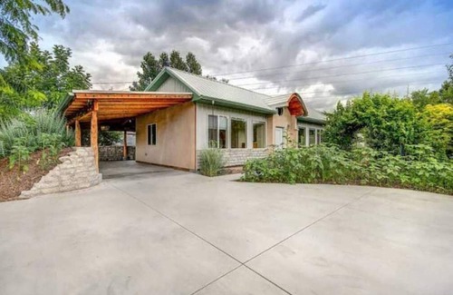 This is a green home built with recyclable materials. The north facing walls are built with straw insulation and earthen plaster walls. The walls inside and those surrounding the private covered patio are built using reclaimed concrete. The 80% passive solar design of the house uses very little energy to heat or cool. There is a wall mounted AC/heating unit as well as electric baseboard heaters for your convenience. There is also a high efficiency fireplace which you are welcome to use if you are staying during the winter months. Have piece of mind knowing that you are staying in a green and sustainable home.