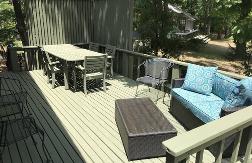 Secluded private getaway on one and a half lots at the end of a cul-de-sac. Home updated with open floor plan, new kitchen, hardwood and tile floors, marble bathrooms, and multiple skylights. Lots of outdoor space for kids to play. Deck and rock patio with furniture for entertaining. Renters have access to 2 golf carts (both carts have 4 seats). Only two minutes from the marina!!