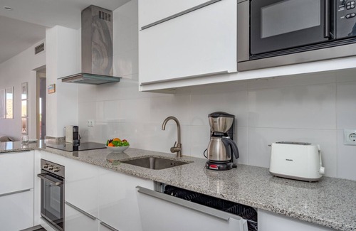 When you enter the apartment you are greeted by a modern and stylishly furnished apartment with a fully equipped kitchen, here you have a dishwasher, coffee maker, toaster, kettle, stove and oven, spacious fridge and freezer, breakfast counter and everything you need for to cook on holiday.