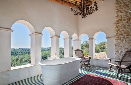 - Large main suite with king-sized bed, free-standing bath, ensuite bathroom, and access to a private balcony with a second bathtub outside