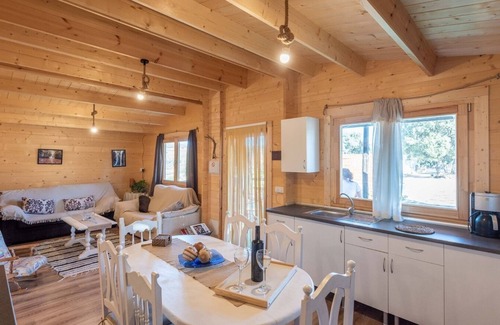 The house is built with pine wood and has two bedrooms, one with a double bed and a bunk bed with two 90 cm beds and another bedroom with a double bed.
