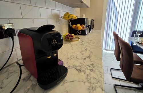 The fully equipped kitchen has everything you need — built-in double oven, electric hob, air fryer, microwave, integrated fridge-freezer, L’OR pod coffee machine, dishwasher, and an AI washer-dryer. Whether you're preparing a full dinner or enjoying a quick breakfast, the space is set up to make it easy. The extendable dining table comfortably seats six, perfect for shared meals or remote working.