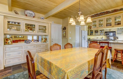 Step into this elegant Sun Valley condo reminiscent of a French country home and you just might ask, 'Am I in Idaho or Provence?' Nestled in a wooded niche on Trail Creek, this condo's wooden beams, stylized columns, ornate moldings, and attention to detail make it a portal to a French country home. Take off your shoes, settle into a comfortable chair with your feet on the ottoman, and dig into that novel you have been meaning to read for so long. Sip a glass of Merlot to the soft sound of music on the stereo and no, you won't miss your favorite TV show; there's cable and Internet access on the new 40' Samsung smart TV so you can log in to your Netflix account. Bring your laptop and tablet too, as there is free WIFI and a little office nook where you can work in private if need be. When it's warm, fire up the grill on the deck and barbeque your meal.