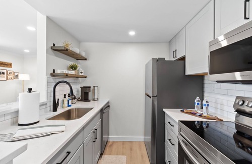The condo features one bathroom with a shower/tub combo, accommodating guests traveling with small children. The bathroom features bright lighting and a 36-inch vanity with an accompanying large mirror. Freshly laundered towels, washcloths, and hand towels are provided for guest use. For guest's health and well-being, natural & non-toxic shampoo, bodywash and hand soaps are provided.