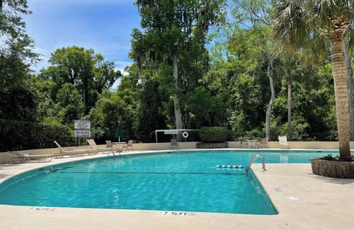 Peaceful lagoon retreat. Elegant condo nestled in a serene plantation just a 5-minute drive to the private beach. Modern decor and amenities ensure a comfortable stay. Enjoy bike paths throughout the plantation with an array of wildlife. Private tennis court, pickleball court and short walk to the pool. Great location next to Coligny Circle. Free Wi-Fi and parking. Perfect for a romantic getaway, golf or tennis vacation.