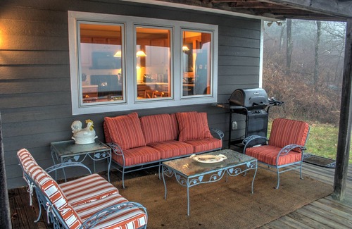 This home has a wonderful split deck/porch where you can sit outside and enjoy the views and cool crisp mountain air no matter the weather. Sit under the porch if you like shade, or if you need a dry place to read a book on a misty day. Sit out and dine in the open air and enjoy the distant vistas. The porch/deck is a wonderful outdoor living room. It has a gas grill, a table with chairs, chaise lounges, a swing, and a hammock. It is surrounded by wildflowers and wild garden plants. The spacious living room and well-equipped eat-in kitchen's large windows bring the views inside, while the hardwood floors, oriental carpets, and the stone accent wall in the living room convey elegance and warmth.