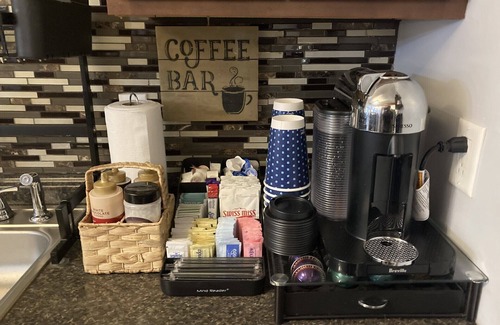 There is an office corner equipped with a printer and a phone charging base. The rustic style kitchen has fully stocked custom built in beverage, coffee, and breakfast bars. The built-in bar includes a mini refrigerator, fruit cooler, and is equipped with all the tools you need to make your favorite cocktail. Make yourself at home and enjoy your stay.