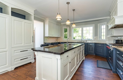 Gourmet kitchen with a granite top island with seating for three. Two sinks accompanied by high end appliances such as, gas stove, oven, microwave, and two dishwashers.