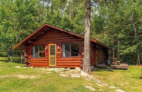 The great room features a vaulted ceiling, Northwood’s style log furniture, flat screen television with ROKU and a complete kitchen. This cabin has a full bath with a tub and shower. Each of the two bedrooms have a king bed. There is extra sleeping in the living area with a full-size futon. A small boat dock, sun deck with Adirondack chairs, picnic table, charcoal grill and campfire ring are all provided at your cabin. This cabin is rated for 4 guest sleeps up to 6. A wood fired Sauna is within walking distance from the cabin.