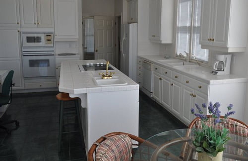 A 3000 sq ft home overlooking Big Bay Creek and miles of scenic marsh view and Wyndam Golf Course and ponds opposite. Formal dining room, modern kitchen with breakfast table, large screen porch to relax and view wildlife, large high ceiling great room with gas fire place. 2 master king bedrooms, one queen, and one with twin and double. 3 bedrooms w/ private porches. Within walking distance to the beach and on a paved path for exploring the entire island by walk, bicycle or running. Wyndam Resort/golf course is across the street with new upscale restaurants and club house. Charcoal Grill, pots, cookers and utensils for outdoor cooking are provided.