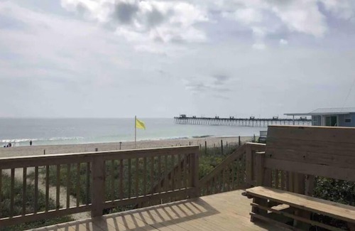 1 block from beach w/private parking lot .37 spaces-first come first served. has shower & walking distance to Bogue inlet pier. Soundside public access w/pier & limited parking - can walk or bike easily. Apartment Located steps from bike path: walk or bike to restaurants, pier, shopping, grocery. 1 mile from public boat ramp. apt sleeps 2 with 1 queen bed & 1 futon. Fully equipped Kitchen. Hot/cold outside shower. Gas grill. 2 beach chairs. 2 beach bikes. Linens & towels.