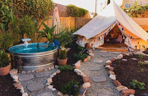 Beautiful private bell tent nestled in a herb garden with electric fireplace during the winter, rustic fire pit, stock tank pool, Kitchenette and heated out door shower with flushable toilet and sink. The space does not have a space to cook however it is equipped with a mininfridge microwave coffee pot snacks tea coffee and waters. Please leave any dishes you may use in the kitchenette area and we will take care of them. There is a basket in the tent reserved for bath towles. No need to change sheets or take out trash. We take care of everything for you! We just ask you respect the space and enjoy yourself When checking in please park in driveway directly in front of side yard gate. There is a camera for guests sexurity and safety at the entrance. Enter through gate and enjoy the space! We ask that you remove you shoes upon entry of the tent in a attempt to keep it as clean as possible for guests. Entire private yard is yours to enjoy for your entire stay. Upon check out please message us to let us know you have checked out. PLEASE NOTE this is a tent in a safe suburban neighborhood. You will be having a outdoor experience. The pictures do display that however some people assume its a house and a tent 😅.. if you love the outdoors and want a safe private clean experience, you should have a great time. Thank you for concidering our listing and hope to see you soon.