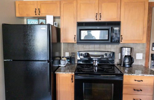 Equipped with all the basics, you will find yourself at home in this suite. The kitchen has a full-sized fridge, microwave, stove and dishwasher. The master bedroom has a king-sized bed and a four-piece on suite. The second room has a queen-sized bed. There is plenty of seating in the living room which has lots of natural light. The living room includes a queen-sized sofa bed with a comfortable memory foam mattress. There is complimentary WIFI and a flat-screen TV. The balcony has amazing views and a natural gas BBQ for cooking. The lodge has two all-season outdoor hot tubs and a workout room guests can use.