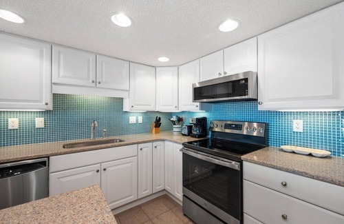Let this unit turn you into a morning person as you wake up to the waves crashing on the beach outside. Once awake, grab your cup of coffee and head out to your well-sized balcony to enjoy the beautiful sunrise and plan out your fun filled day. Inside, an updated kitchen awaits with granite countertops, tile backsplash and stainless-steel appliances that is ready for all your culinary creations. The master bedroom has a huge king-sized bed and offers ocean views. The second bedroom has two queen beds. Two full bathrooms makes getting ready for your fun-filled activities easier and faster. There are flat screen TVs in the living room and each of the bedrooms and of course free Wi-Fi. There is also a large washer and dryer for guest use.