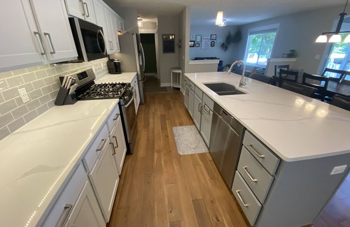 Stay at a beautiful two story family home with finished basement, large outdoor patio and deck with ample outdoor dining space, outdoor shower, kids play set and a huge 70ft beach on a large swimming pond full of kayaks, paddleboard and a Lilly pad and catch & release fishing! Relax in the 7 person Master Spas hot tub after a fun day exploring Lake Michigan. Gas fireplace outdoors as well as wood solo stove and propane grill/griddle combo for your use. All bedrooms have blackout curtains to sleep in after fun in the sun. This is a private full time residence so owners belongings may be in rooms/closets, as well as children's toys. High chair and pac n play is available if needed. Can sleep 8 adults in 4 rooms and has more common areas for kids to spread out in sleeping bags/air mattresses. Great for hosting a large extended family or friends with multiple families! Available for Coast Guard Week in Grand Haven, only a 10 minute drive to Lake Michigan! Paved bike trail winds through the neighborhood and can use in either direction for miles, all the way to Spring Lake, Ferrysburg and Grand Haven!