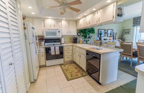 Enjoy the open floor plan as you walk into this spacious condo with over 1,200 square feet of living space. The living room features a leather sectional couch, 2 recliners, a 55" smart TV, a DVD/VHS player, a bookshelf full of books, and sliders to the private, ocean-view balcony. For those who enjoy cooking, the fully equipped kitchen features everything you'll need to prepare your favorite home-cooked meal. Items include a crock pot, blender, kettle, Keurig and regular drip coffee maker, and all other cooking essentials. Delight in meals with family as you sit around the dining room table, with seating for 6, as you take in views of the ocean. Additional seating for 2 can be found at the kitchen counter.