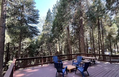 Drive 1 hour from Sacrmento or South Lake Tahoe to a gated home in the forest with wrap around deck and 4 designated parking spaces available upon entrance with street parking available as well. Our front yard will make you swoon, surrounded by towering pine trees and visited by delightful birds and busy squirrels, make sure your camera is charged and ready to capture lasting memories!When you enter the cabin, you’ll notice the soaring open beam ceiling and an open floor plan that captures the fully equipped kitchen with large appliances and a coffee station, dining table, and a relaxing living room equipped with sizable Roku TV facing large windows with pine trees decorating your window views. There are two sliding glass doors leading out to the sprawling deck with an incredible view. The deck is the perfect spot to drink your morning coffee or tea and enjoy the peaceful nature.