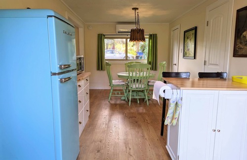 Inside the cottage, you’ll be able kick back and relax by enjoying your favorite streaming services on the smart tv or play a board game or do a jigsaw puzzle. The heat pump affords a comfortable climate, automatically heating or cooling as the temperature dictates. You can whip up a meal or snack in the efficient kitchen fitted out with a Breville microwave/air fryer/toaster oven, induction hot plate, and electric grill as well as dishes, glasses, pots and pans. You’ll find some farm eggs in the fridge as a welcome gift.