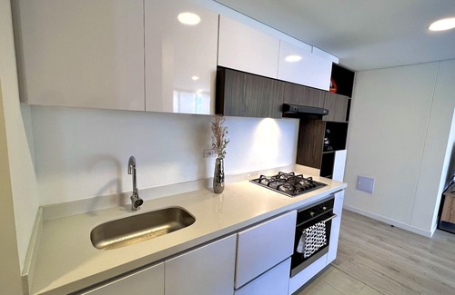 El apartamento cuenta con una hermosa y amplia sala, un sofa cama bastante amplio, con su televisor de 55” pulgadas, la cocina se encuentra equipada con los implementos necesario para estadías largas, su nevera, lavadero y una lavadora y secadora independiente.