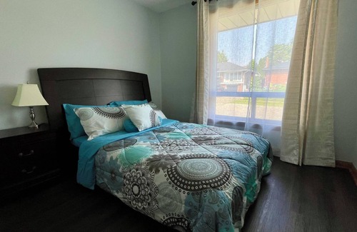 Offers modern living room with a large TV, bright bathroom. it has a spacious kitchen with new appliances. Parking for two vehicles on a driveway. You can enjoy your morning coffee with toast & there is a lot of space to do office work. Toronto Pearson Airport (5 minutes), Downtown/ Mississauga/Vaughan/Scarborough (20 min. by car).