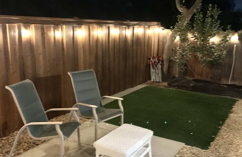 There is an open kitchen and living room area that opens via an oversized sliding glass door into the back yard. The kitchen offers everything you will need to prepare any meal including plenty of storage and brand new appliances. The living room offers mid-century furnishings, a 50 inch Roku TV. Full cable programming is provided. The home offers very HIGH speed internet of 200 mbps so you can stream or easily work from home.