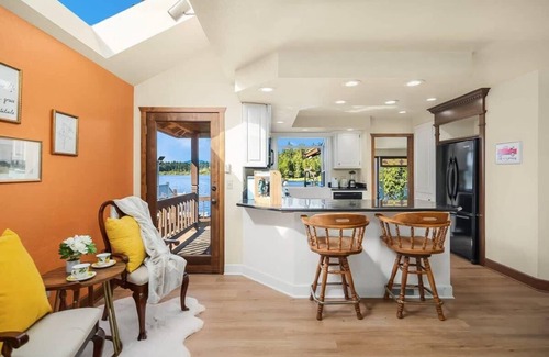 Our cozy living room is an ideal setting for a family gathering. Sit back and decide if you will watch a movie, sit by the cozy fireplace or enjoy the amazing lakeside view! Easily change the settings by going through the French door to the patio. Not to mention YouTube TV with 80+ live channels, Netflix, and Disney+, they are all free to you.