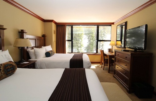 This 7th floor Deluxe Queen Room with Forest View features 2 queen beds, entry closet, desk, flat-screen TV and full bath.