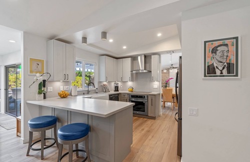 This vacation rental home in Palm Springs has been recently updated to feel like a “Home away from Home”. It has tile floors throughout and has been tastefully decorated for ultimate comfort. The kitchen boasts granite counters and is fully equipped so you can have the convenience of cooking just like home. A welcoming atrium with garden and pool views is at your disposal for a quick snack or morning coffee.