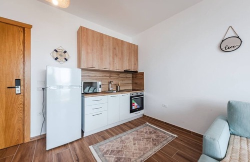 Step inside this cozy apartment with an amazing view, furnished in light colors and equipped with air conditioning. The walls are painted in soothing coastal tones, reflecting the nearby sea. The bedroom is designed for comfort with a double bed next to the window, perfect for natural light. After a day exploring the city, relax on the private balcony overlooking the beautiful waters. The kitchen has everything you need, and outside, a sunny dining area with comfy furniture is ideal for enjoying meals or relaxing under the stars. Perfect for travelers looking for a peaceful getaway in charming Vlora by the sea.
