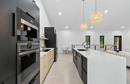 Escape to Happie Space on Snow Lake, a modern smart home with panoramic lake and park views. Enjoy a chef’s kitchen with built-in latte machine, open-concept living, and a 12' full panel accordion patio door that brings the outdoors in. Relax on the deck, patio, or in hammocks by the garden. Private beachfront, paddle boards, dock access, firepit, and outdoor shower. Plus a yoga studio to unwind. Cozy meets lake life—perfect for rest, recharge, and fun. Happie Space on Snow Lake, a newly built lakefront smart home overlooking Snow Lake, Lake James, and Pokagon State Park. Designed for relaxation and connection, this bright and modern retreat features luxury amenities, a private beach, a full deck and patio setup, and a serene yoga studio — all just steps from the water. Happie Space on Snow Lake, your lakeside sanctuary designed for peaceful mornings, golden hour evenings, and everything in between. This modern, new-construction home sits directly on Snow Lake, part of the Lake James chain, and offers panoramic views of both lakes and Pokagon State Park. Open-concept living area with a 12-foot accordion-style glass door that opens fully to let in the lake breeze, complete with a custom screen. Smart home features throughout: automated lights, blinds, security cameras, and more. Fully stocked chef’s kitchen with stainless appliances and a plumbed automatic coffee/latte machine — just add beans and press a button for barista-quality drinks. Two cozy bedrooms plus a scenic loft bedroom with breathtaking views, 1.5 modern bathrooms thoughtfully designed for comfort and convenient laundry area to make longer stays feel like home. Expansive upper deck with lounge seating, outdoor dining area, and built-in speakers for easy entertaining. Covered lower patio with more seating and a stereo system — perfect in any weather. Fully fenced backyard with lush gardens, hammocks, and peastone lounging areas. Private beachfront with peastone, steps into the water, a firepit, and lounge chairs for stargazing and sunbathing.. Outdoor shower to rinse off after a swim or day on the lake. Shared dock for parking one watercraft, with calm cove waters ideal for private swimming. Two paddle boards available for guests to enjoy peaceful morning paddles or lake adventures. An attached private studio equipped with yoga mats, blocks, balls, and a sound system — the perfect spot to stretch, meditate, or simply unwind when not in use by the owners for their business. Whether you’re enjoying a morning coffee on the deck, reading in a hammock, soaking in the view from the loft, or spending golden hour by the firepit, Happie Space on Snow Lake offers the perfect blend of comfort, style, and nature.