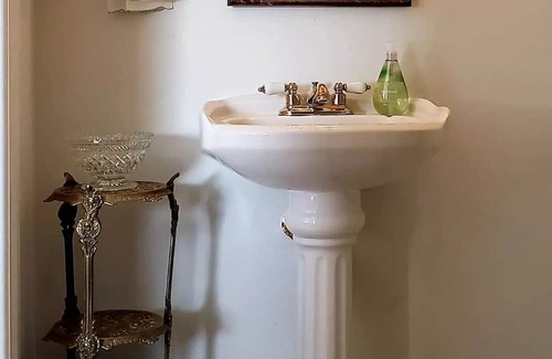 The Garden Room Ensuite has heated marble floors in black and white in a traditional basket weave design. It has a marble shower and pedestal sink. The shower faucet has been altered to deliver a refreshing stream of water that makes it possibly the best shower for our guests they've ever experienced.