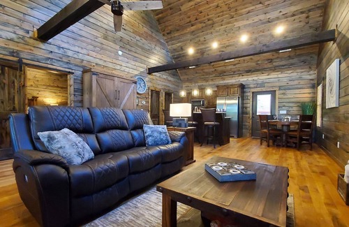 As you enter, you'll see the cabin is spacious, yet cozy with high-end furnishings. The great room has leather furniture a gas fireplace, and TV. The adjoining kitchen features a 3-stool bar area and 4-person dining table. The fully-equipped kitchen features granite counters, stainless steel appliances, while the Great Room features a rock fireplace, richly stained Pine interior, and windows that bring in the scenic outdoors.