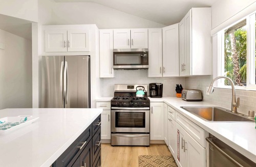 The home’s colorful design begins in the living room where seating is arranged around a large screen smart tv. Included is a sleeper sofa to provide extra sleeping space for your group. Just beyond is the bright kitchen with its stainless steel appliances, wide island, barstool seating, and a range of cooking tools. Always a central part of the home, this space is equipped for both the preparation and enjoyment of food at home. A formal dining space is set for 6. If you’re enjoying dinner and a drink, make use of the dedicated bar cart.