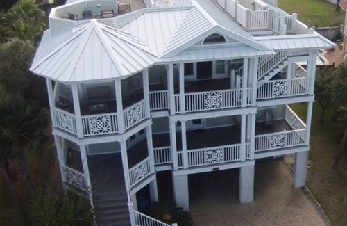 Serenity is one of the most spectacular homes on the North end of Tybee Island. A short walk to the beach or the Tybee Lighthouse, this 5500 square foot home includes six bedrooms all with adjoining full baths, and an additional 2000 square feet of porches and a one-of-a-kind roof deck with a fully equipped outdoor BBQ grill/stove, hot tub, and sun deck. The house has an elevator serving all living levels as well as an accessible equipped bathroom. Learn about the historical aspects of Tybee Island, Fort Screven, and nearby Fort Pulaski during your stay-- the entire home is decorated with hundreds of photos, engravings and art cataloging the history of the area for the past 200 years.